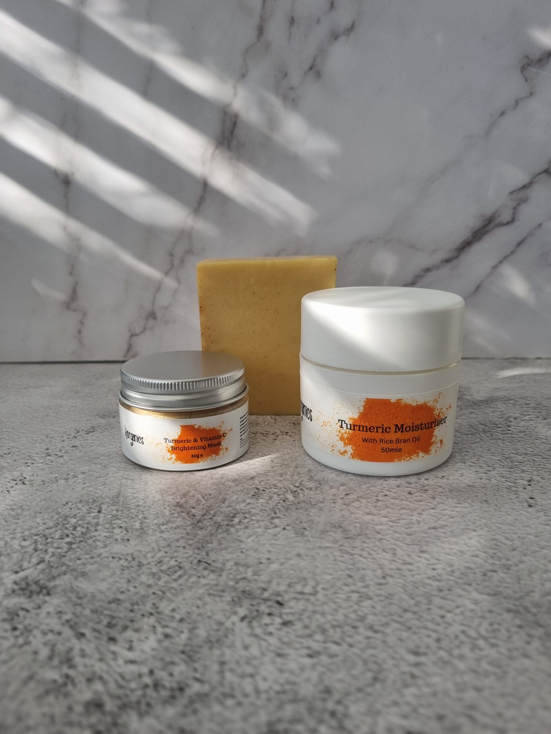 – Turmeric Glow Bar, a fragrance-free soap bar suitable for all skin types. Infused with the powerful properties of turmeric , oatmeal and shea butter this soap is perfect for those looking to achieve brighter and more radiant skin. Can help reduce hyperpigmentation, dark spots